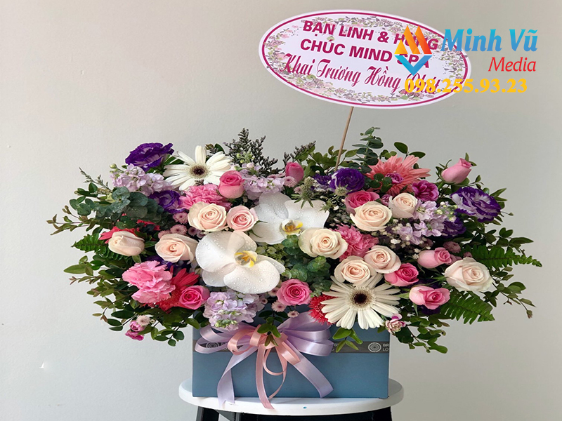 Hoa khai trương có thể là kệ hoa tươi, giỏ hoa, bình hoa hay lẵng hoa. Bổ sung đính kèm lời chúc và tên người gởi bên trên. Dù bạn có tới tham dự hay không thì việc gởi tới lãng hoa mừng khai trương cũng vô cùng hợp lý. Chúng có thể thay cho lời chúc mừng của bạn đến với công ty.