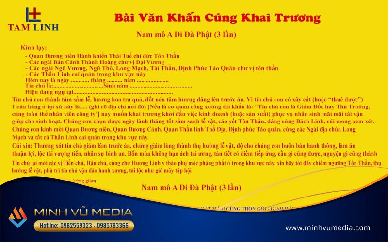 Lễ cúng khai trương đánh dấu một bước khởi đầu mới với niềm hy vọng và tôn trọng truyền thống. Bằng cách tuân thủ các lưu ý quan trọng và tổ chức lễ cúng một cách đúng đắn, Minh Vũ mong rằng sự kiện của bạn sẽ trở thành một kỷ niệm đáng nhớ cho cửa hàng hoặc doanh nghiệp của bạn.