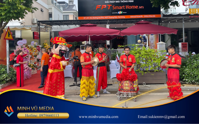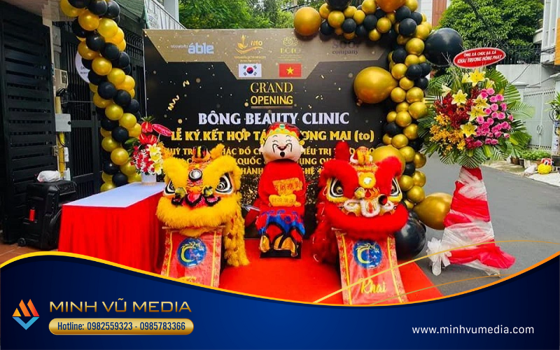 Tại đây, Minh Vũ cung cấp đầy đủ dịch vụ tổ chức khai trương. Đi từ dịch vụ tổ chức khai trương trọn gói cho đến cung cấp dịch vụ gói nhỏ đi kèm theo như: tổ chức tiệc trà, trang trí khai trương, thiết bị sự kiện, múa lân sư rồng,…