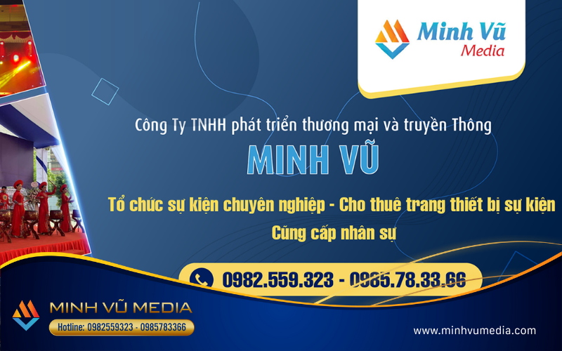 Minh Vũ Media là công ty chuyên cung cấp dịch vụ tổ chức sự kiện chuyên nghiệp. Một số sự kiện được Minh Vũ Media tổ chức trọn gói dịch vụ có thể kể đến như: tổ chức khai trương, tổ chức lễ khánh thành, tổ chức khai giảng, trung thu,… Ngoài ra, Minh Vũ còn cung cấp một số những dịch vụ đi kèm sự kiện như: trang trí khai trương, thiết kế banner, cho thuê thiết bị sự kiện, nhân sự sự kiện, dịch vụ tiệc trà, tiệc mặn,…