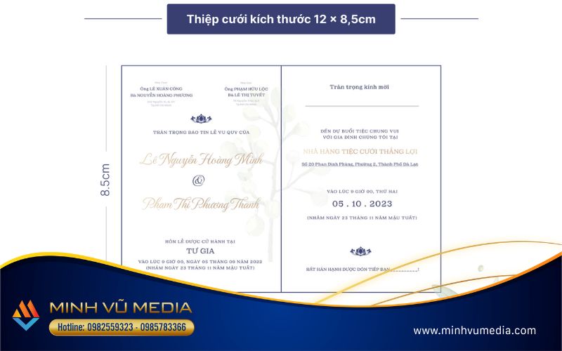Thiệp mời khai trương Spa thường có kích thước hình chữ nhật. Ví dụ như 8x12cm, 8,5x12cm, 10x15cm hoặc 12x18cm. Kích thước này phổ biến và phù hợp cho việc gửi qua thư hoặc trao tay. Điều này giúp giữ cho thiệp mời gọn nhẹ và dễ dàng để người nhận có thể lưu giữ hoặc mang theo.