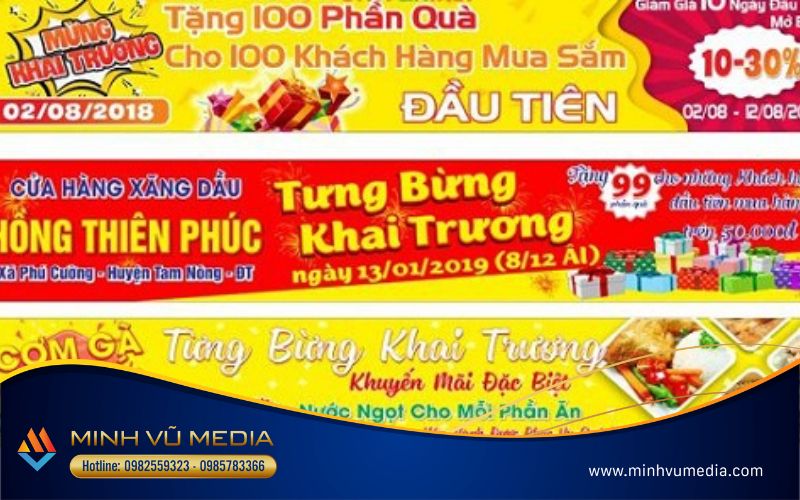 Trên đây là những thông tin và lưu ý Minh Vũ Media muốn giới thiệu đến quý độc giả về kích thước băng rôn khai trương. Kích thước băng rôn có vai trò quan trọng trong việc tạo sự ấn tượng và chào mừng sự kiện quan trọng của bạn. Sự lựa chọn cẩn thận giữa kích thước, loại không gian, mục tiêu và tính thẩm mỹ sẽ giúp bạn đảm bảo rằng băng rôn sẽ phù hợp hoàn hảo và làm cho lễ khai trương của bạn trở nên độc đáo và ấn tượng.