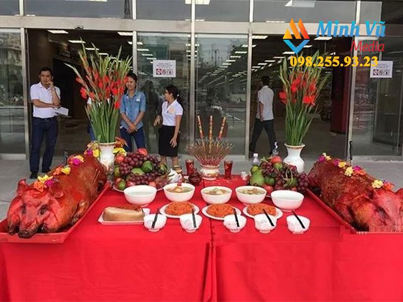 - Mâm cũng của cả lễ khai trương và khánh thành về cơ bản là giống nhau. Bao gồm: mâm ngũ quả, hoa, hương đèn, trầu cao, xôi chè… Cùng các món ăn đại diện cho trời, đất, bộ lễ vàng mã, giấy cúng.