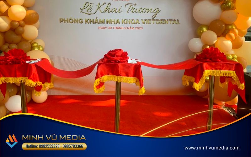 Bàn ghế tại sự kiện khai trương được Minh Vũ Media cung cấp tại sự kiện khai trương của Vietdental. Cụ thể: bộ bàn ghế đại biểu với combo 1 bàn 4 ghế bao gồm khăn trải bàn, bao ghế, nơ ghế trọn gói với tone màu trắng đỏ chủ đạo, chuyên nghiệp. Bên cạnh đó bàn đứng cooktall cũng được hỗ trợ cùng tone sự kiện. Để phục vụ khách mời một cách chu đáo, chuyên nghiệp.