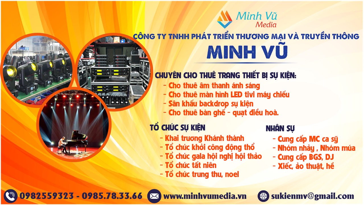 Nói đến công ty tổ chức sự kiện tại Hà Nội sao có thể không nhắc đến Minh Vũ Media. Đây là đơn vị chuyên cung cấp dịch vụ tổ chức lễ khai trương, khánh thành cùng các sự kiện doanh nghiệp như hội nghị, hội thảo trọn gói, vừa cho thuê thiết bị phục vụ việc tổ chức sự kiện như: máy móc, nhân sự như PG, MC, múa lân.